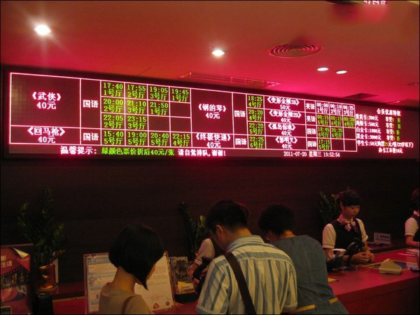 3.可使用紅,綠,黃三種顏色顯示屏上不同類(lèi)型的信息,如場(chǎng)次信息,折扣信息等等。