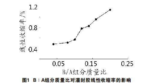 2結(jié)果與討論 2.1線性收縮率 考查A、B組分質(zhì)量比對(duì)灌封膠線性收縮率的影響,結(jié)果見圖1。