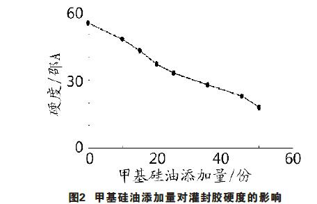 在其他組分不變的前提下,考查了甲基硅油添加量對(duì)灌封膠硬度和膠料混合后黏度的影響,結(jié)果見圖2、圖3。