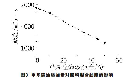 (2) 隨著甲基硅油添加量增加,膠料混合后的黏度和硬度不斷減小,甲基硅油較佳添加量為40份;