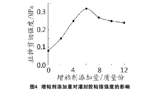 (3)當(dāng)自制增粘劑添加量為5.7 %時(shí),灌封膠拉伸剪切強(qiáng)度較大,達(dá)0. 32 MPa;