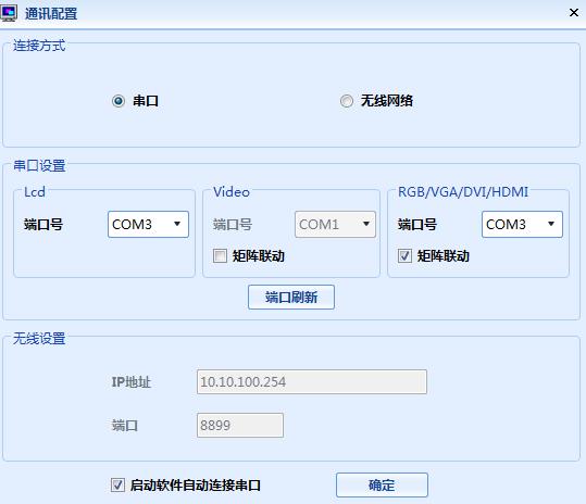 5、 點(diǎn)擊通訊配置,選擇先前查看到的端口號(hào),勾選HDMI下面的矩陣聯(lián)動(dòng),確定。點(diǎn)擊界面上面串口通訊,點(diǎn)擊連接串口??煽吹浇缑孑^下面COM口開啟,即表示已連接成功。