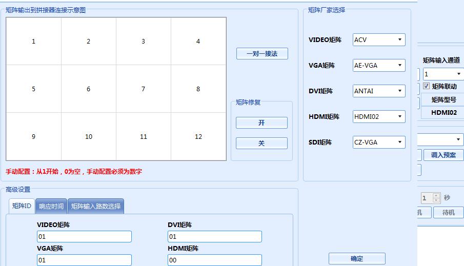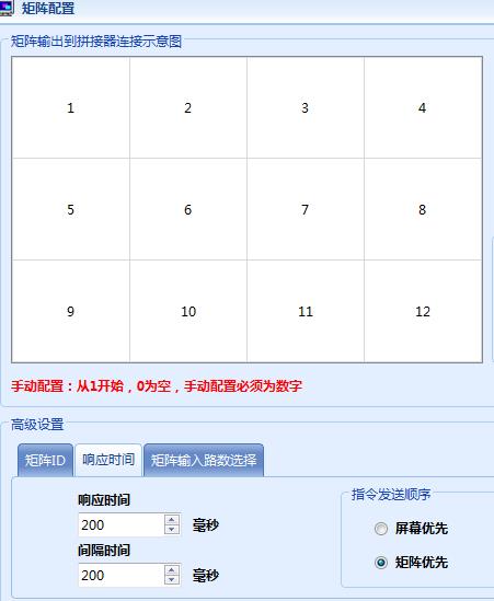 6、 點(diǎn)功能配置—拼接配置---選擇本屏實(shí)際3行,4列,確定。點(diǎn)矩陣配置,右邊HDMI矩陣選擇:HDMI02,下面矩陣ID的HDMI矩陣填00;點(diǎn)擊響應(yīng)時(shí)間,都填上200,確定。