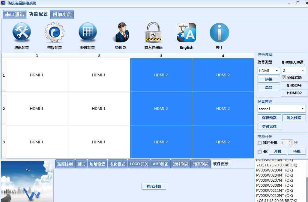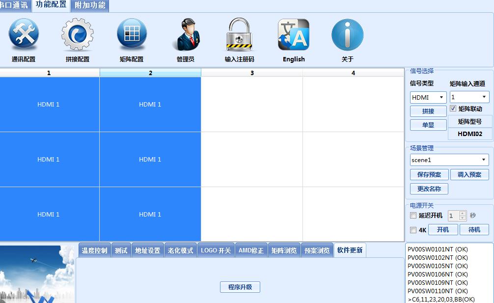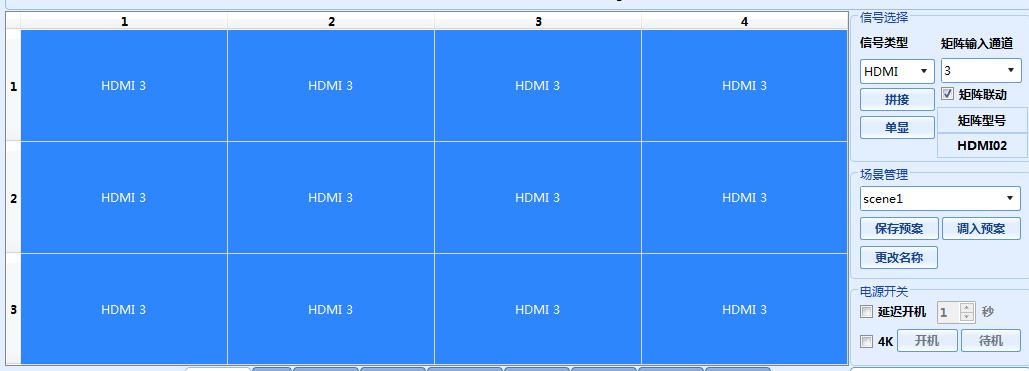 7、 整屏與分屏操作:右邊信號(hào)類型HDMI拼接勾選矩陣聯(lián)動(dòng),矩陣輸入通道,電腦接入的幾號(hào)就選幾號(hào)。如果整塊屏都顯示此通道內(nèi)容,鼠標(biāo)選中所有屏,使之變成藍(lán)色,點(diǎn)擊右邊拼接即可。如果只在一部分顯示就選中一部分點(diǎn)拼接,另一部分沒選的如果沒改變通道就會(huì)留下先前的部分內(nèi)容。另一部分想留藍(lán)色鼠標(biāo)選中后可選沒接路信號(hào)的通道,想黑屏鼠標(biāo)選中后可點(diǎn)擊右側(cè)的“待機(jī)”,關(guān)掉電源。想打開鼠標(biāo)選中后點(diǎn)“開機(jī)”,幾秒后電源打開。