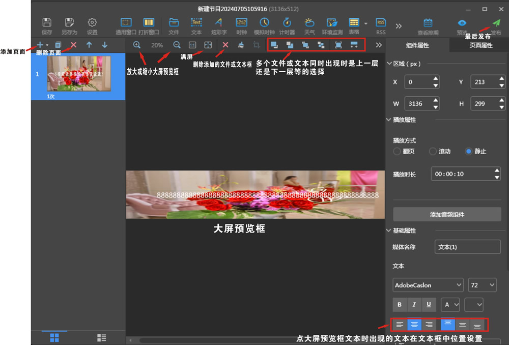四、編輯節(jié)目:首先在終端管理界面,用鼠標(biāo)點(diǎn)擊終端名稱,再在節(jié)目管理界面,點(diǎn)新建,設(shè)置大屏寬高點(diǎn)數(shù)(不是尺寸),如果先前有節(jié)目,只需勾選后點(diǎn)上面編輯就行。圖片和視頻點(diǎn)擊上面文件,點(diǎn)擊后直接從電腦里選擇文件,文字選擇文本。每一次選擇下面大屏預(yù)覽框上較左上角就有個(gè)顯示框,這個(gè)顯示框比較小,可以在右上角設(shè)置大小或者用鼠標(biāo)拉大,也可以用鼠標(biāo)拖著擺放在屏的任意位置。文本需要雙擊大屏預(yù)覽左上角文本框后進(jìn)行編輯。不然找不到編輯文字的地方。大屏預(yù)覽框上面有很多設(shè)置功能可以選擇。